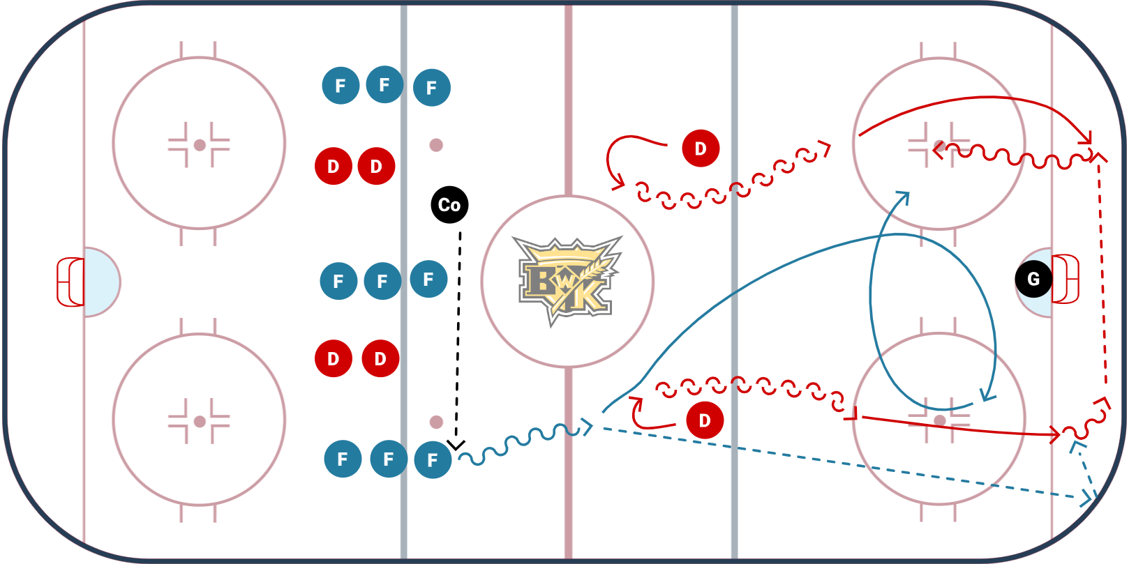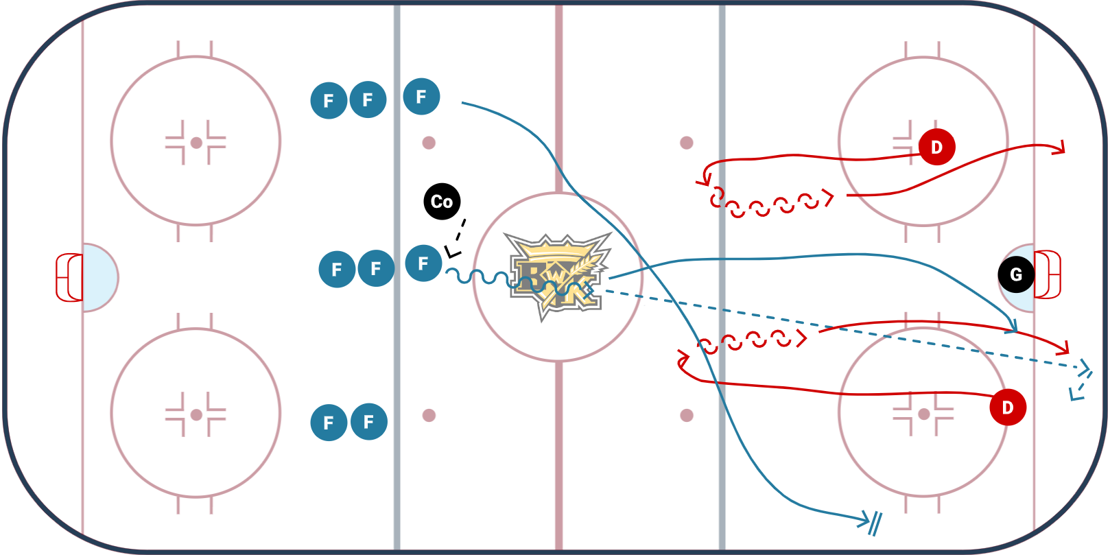 - Whoever the coach passes to, they become F1 and do the same thing. Gain the red line, depsoit a puck and go inside out between the dots trying to squeeze the D up the wall.
