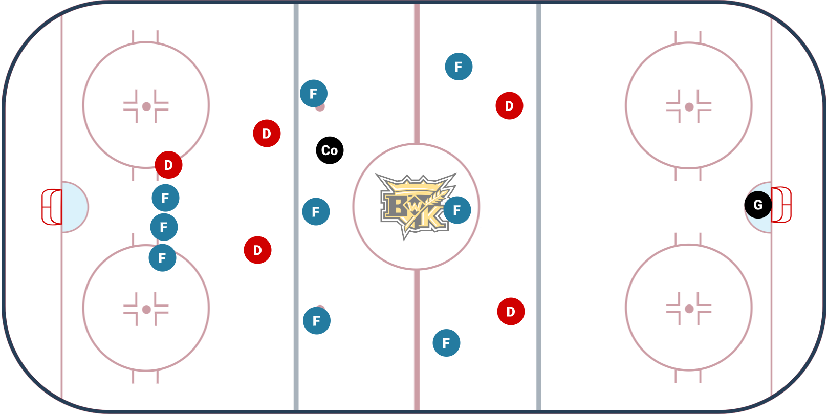 - If the Defence goes D to D, F1 and F2 will reload and reattack the D2 on the weak side of the ice.