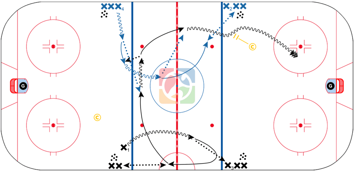 - skates with puck and passes to X3, transitions back towards their original line, receives a pass and one-touches it back.
