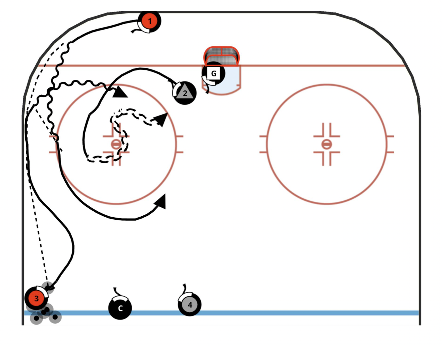 F3 starts play by rimming puck down the wall to F1. F1 skates up the wall protecting the puck from defender D2. Coach can now send in just F3 to create a 2v1 or can send both F3 and F4 to create a 2v2 situation. D2 must quickly read the play and defend accordingly.