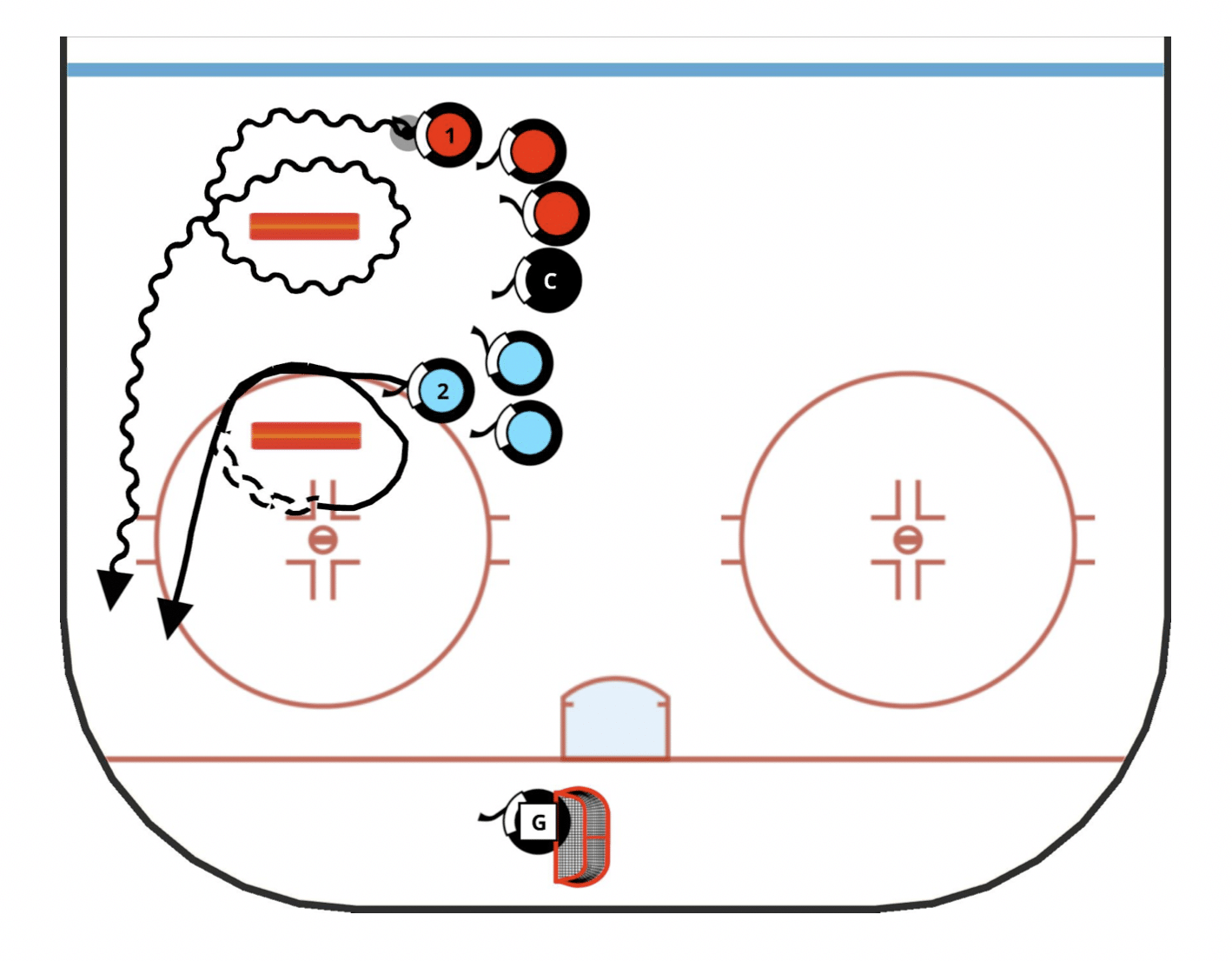 Place a net sideways against the end boards. P1 and P2 start on the whistle, skating complete loops around the rink dividers. P1 tries to drive to the net as P2 tries to angle P1 to wall.