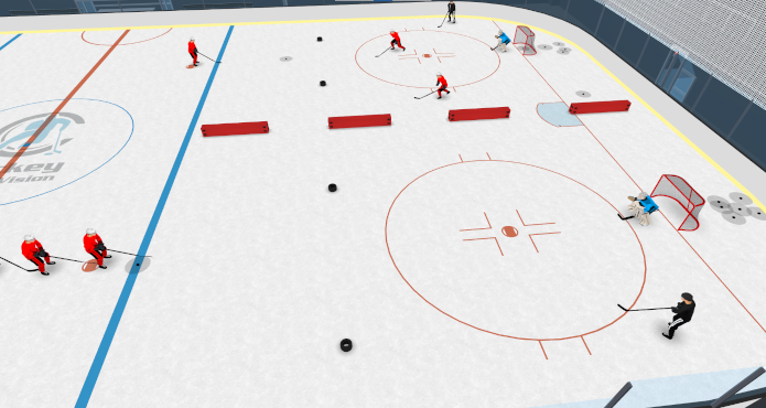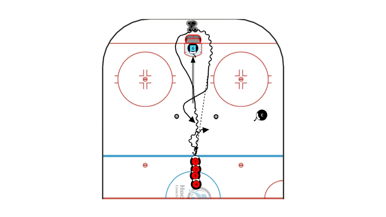 P1 sprints in to score. After the shot P1 goes behind the net to pick up a puck drives back towards the line and passes to the next player in line. The player that receives the puck has to go on the outside of a cone to attack the net. The player that makes the pass has to read which way the attacker goes and has to go around the same tire to “backcheck”.