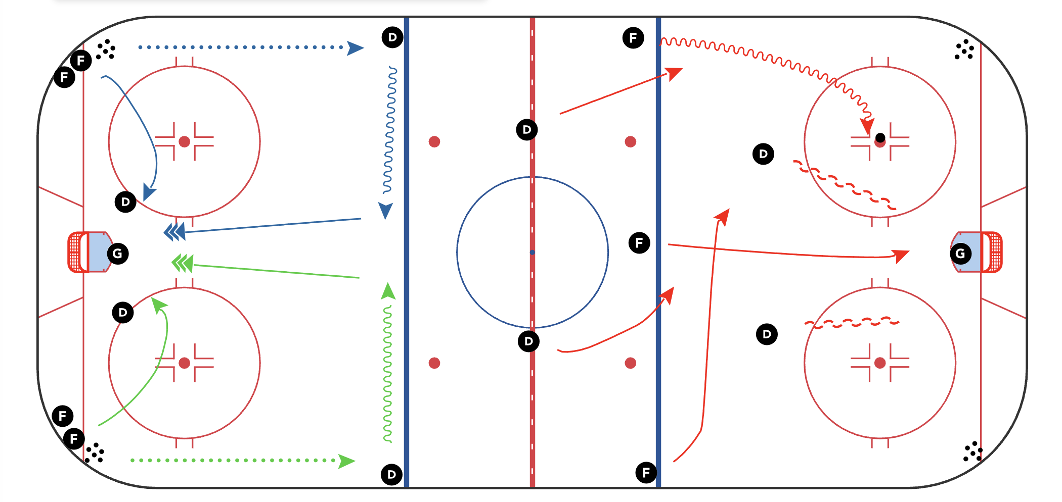 - After the shot is taken, the opposite line passes to the D and the 2 forwards battle the 2 defence in front of the net.