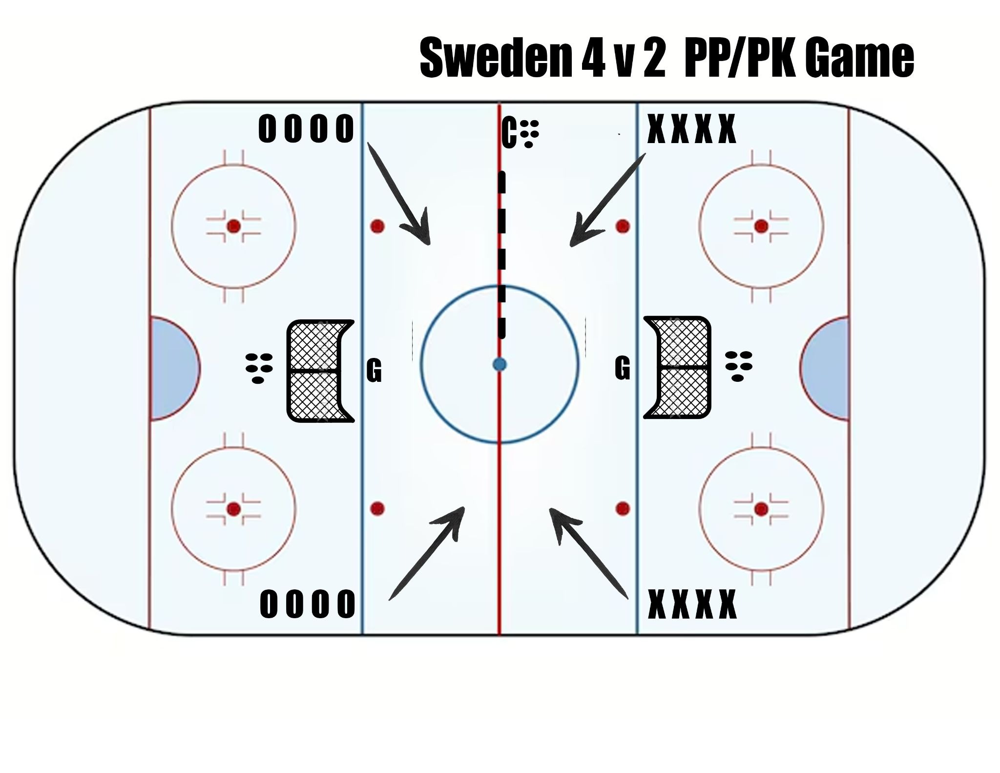 Focus of the game is getting possession of the puck, keeping it and scoring with the man advantage. 2 v 2 turns into a 4 v 2 when the team earns possession of the puck. Players involved with the original 2v2 can go anywhere in the neutral zone, added players (2 extra) can only go on their side of the red line. Score, and you keep the puck (breaking out from behind your own net). Other team misses the net, you get a new puck from your own end and keep the man advantage. Play till whistle. New 2 v 2 every minute.