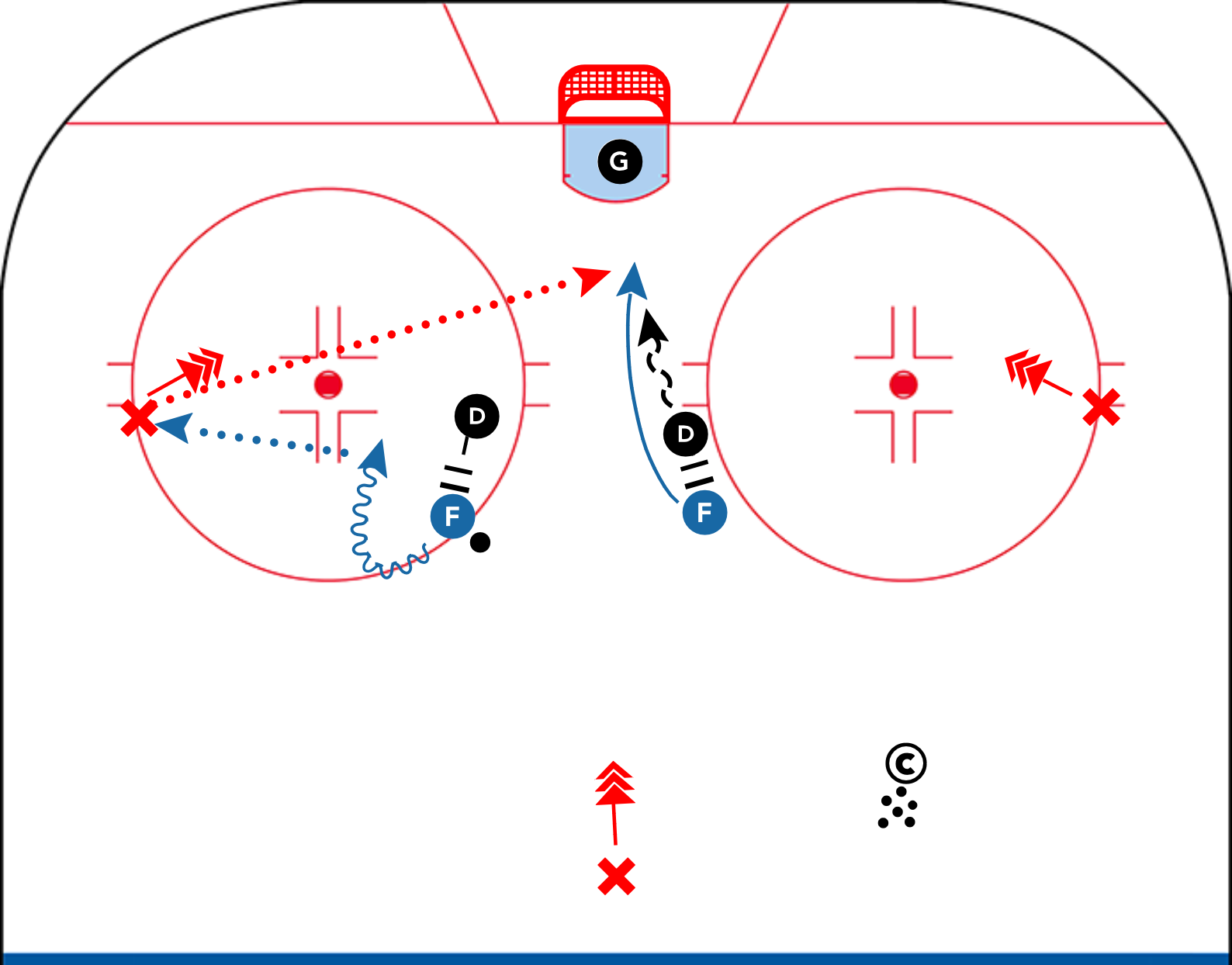 • 2 Forwards have 3 shooters/passers on their side. 2 Forwards can give ‘n’ go with 3 outside shooters. Shooters can not keep the puck, but send it right away on net or to driving Forwards stick. Forward s drive and fight for position in front. If puck goes below the goal line or out of the zone –> Coach will give new puck to one of the 2 Forwards.