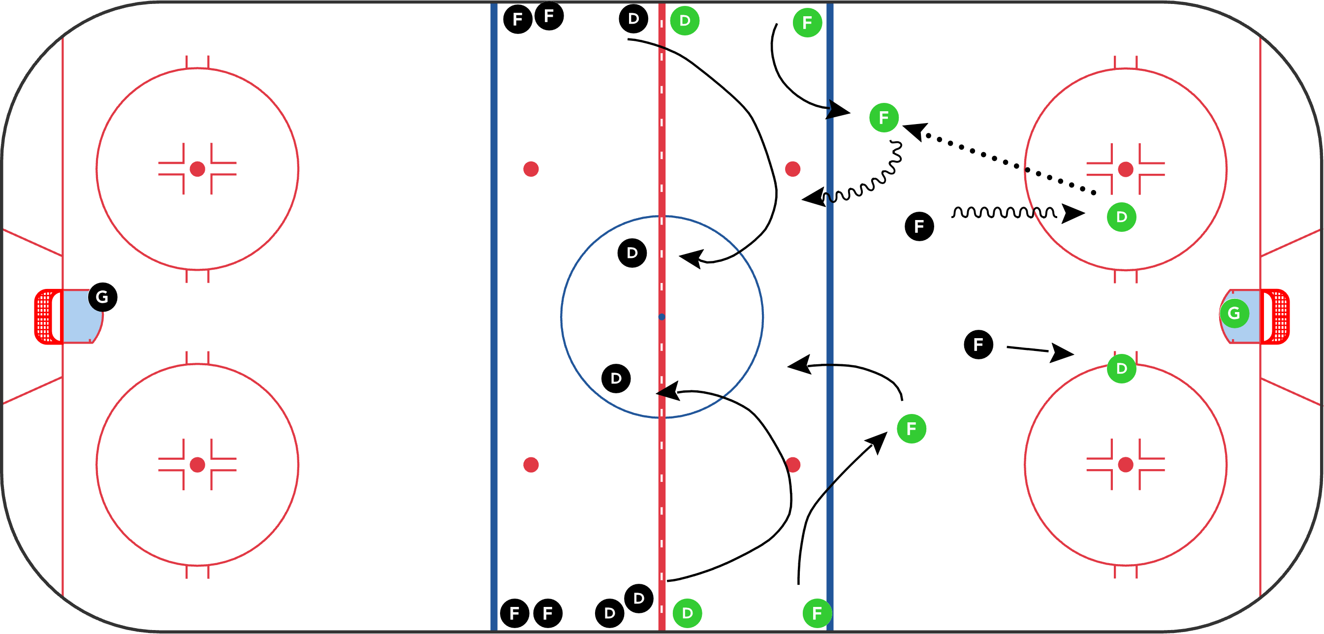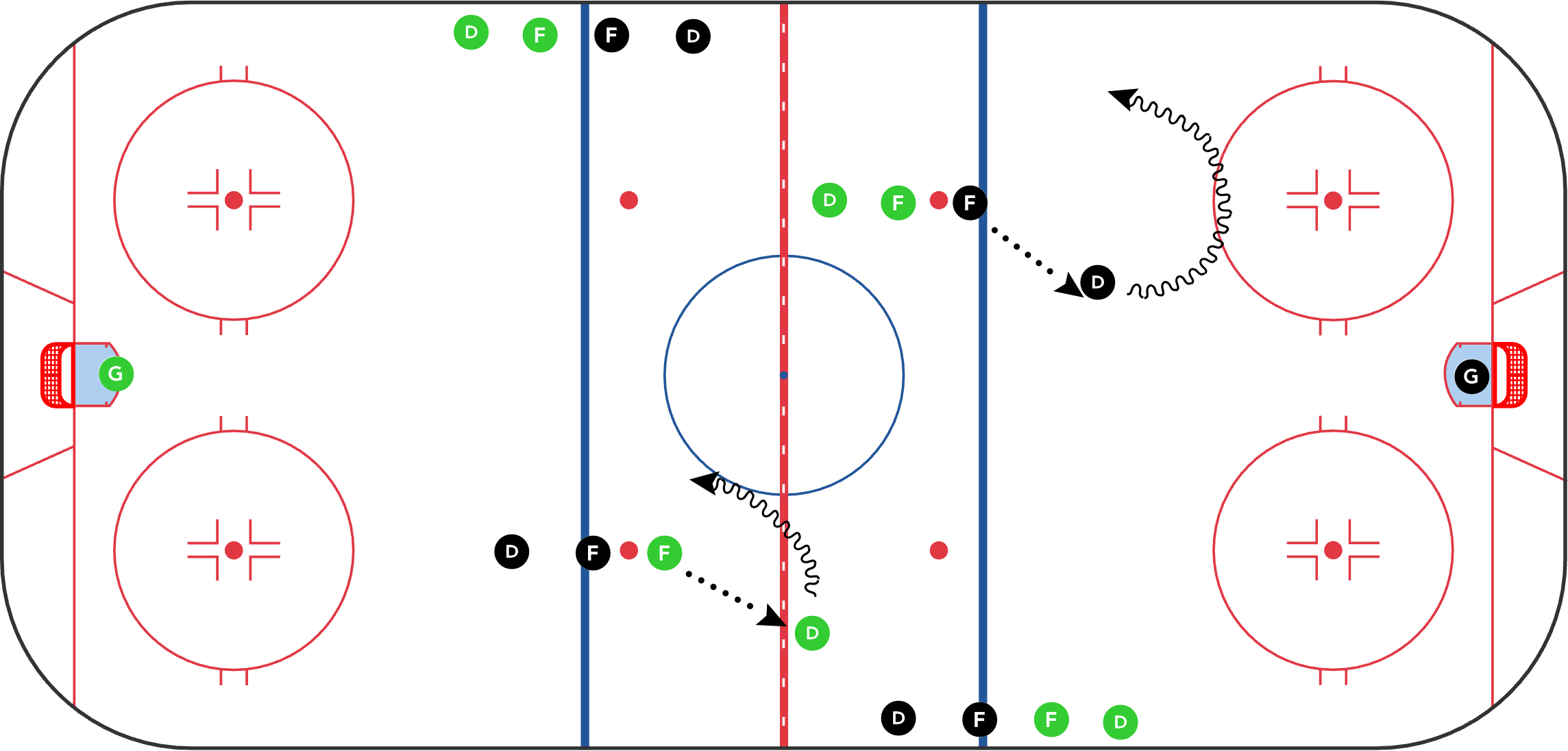 - Original D try to retrieve puck and pass to next two forwards, who play full ice 2on2 vs next two D