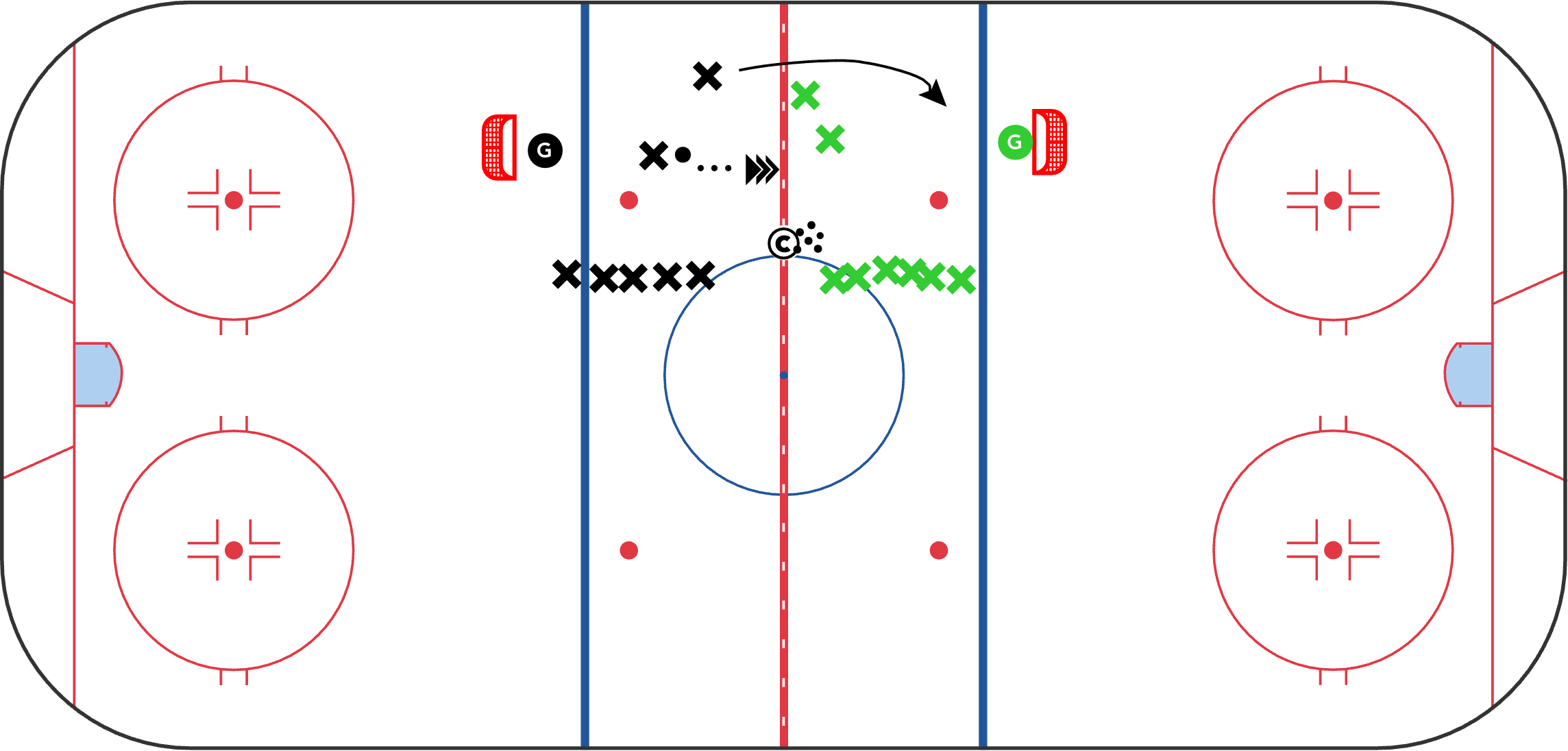 Just like the name suggests, this is a 2on2 that starts with a neutral zone faceoff. I'm a big believer in starting as many drills as possible with faceoffs. Gives more players the opportunity to practice draws aside from the centres, and it starts with controlled chaos. The routes after the draw aren't predetermined, so the players need to solve the problem of entering or exiting the zone.