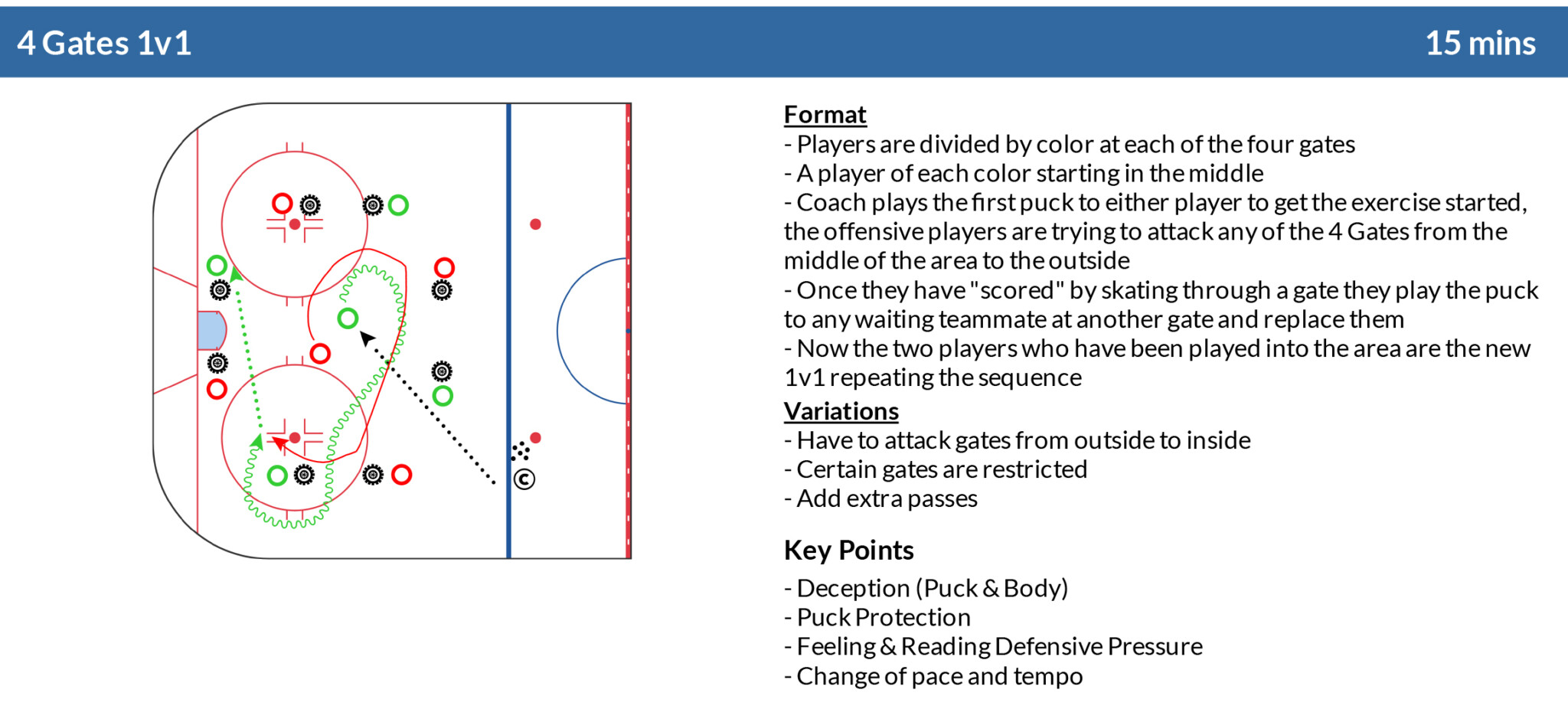 Using this framework of representative design to think about the specific tactical and technical elements of building “hockey sense,” I’d like to introduce three exercises to build layers of hockey sense and help players build an understanding and snapshot of what it looks like in the game.