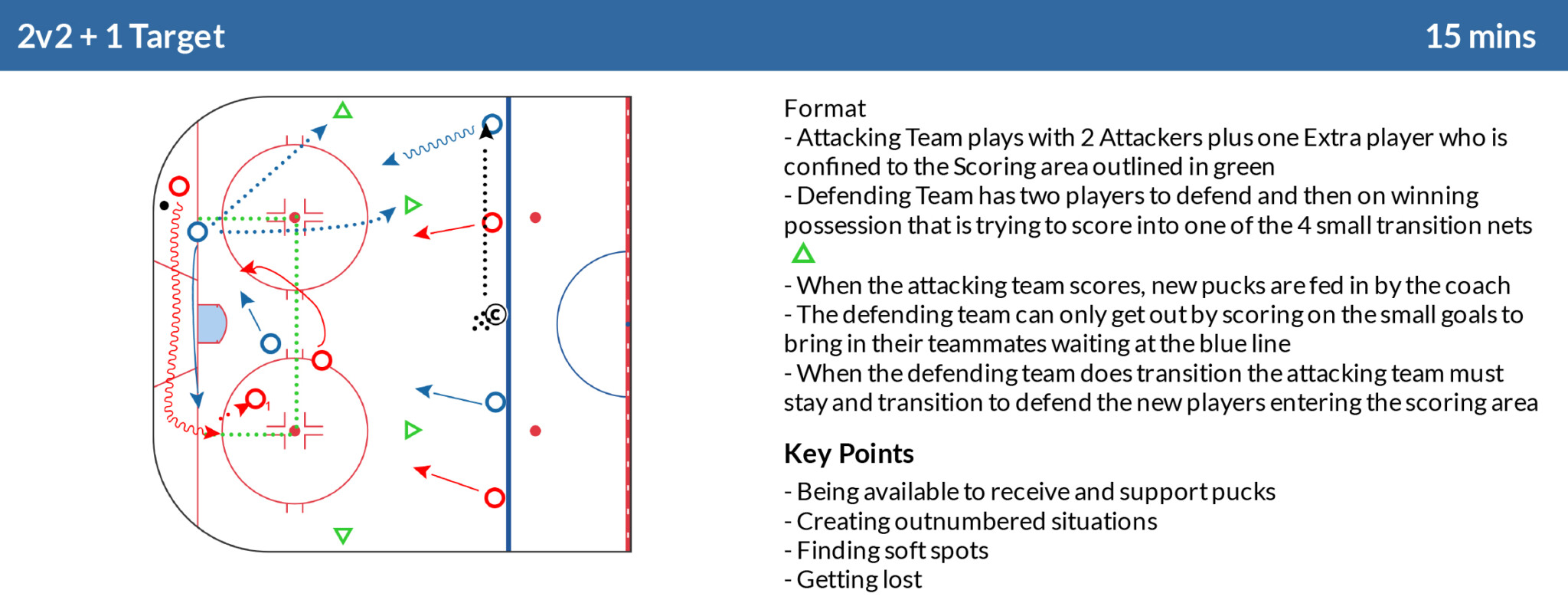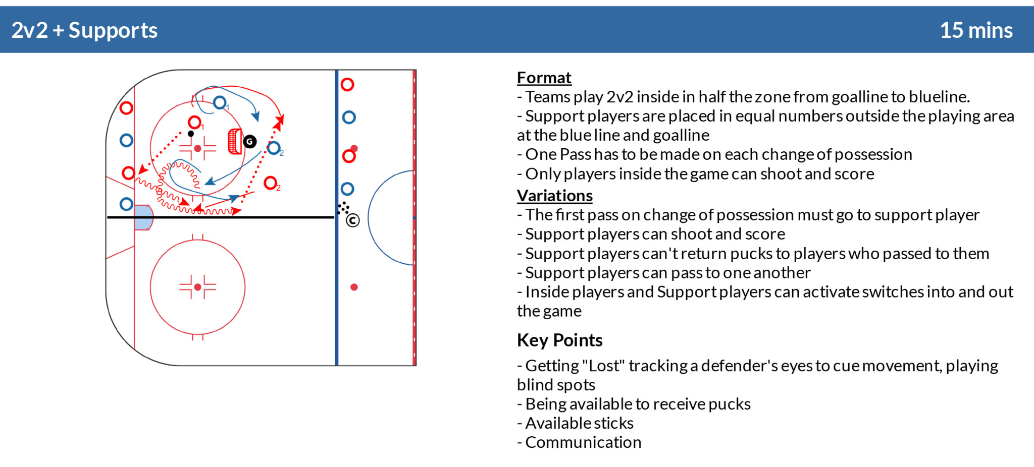 This exercise forces players to develop their ability to support the puck. The design of the game area (longer than wide) gives offensive players the chance to take up deceptive positions to support the play. They also develop an appreciate for tracking their defenders head and eyes to aide in getting lost in coverages. As well, the additional of outside support players offer chance for attackers to move into advantageous spaces.