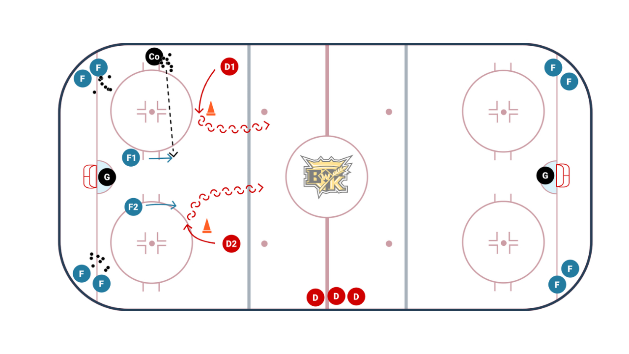 - After the D makes the pass they sprint to the top of the circle, slam on the brakes, skate back to the dot, stop, and then get up the ice to set a strong gap on the forward coming in off the rush.