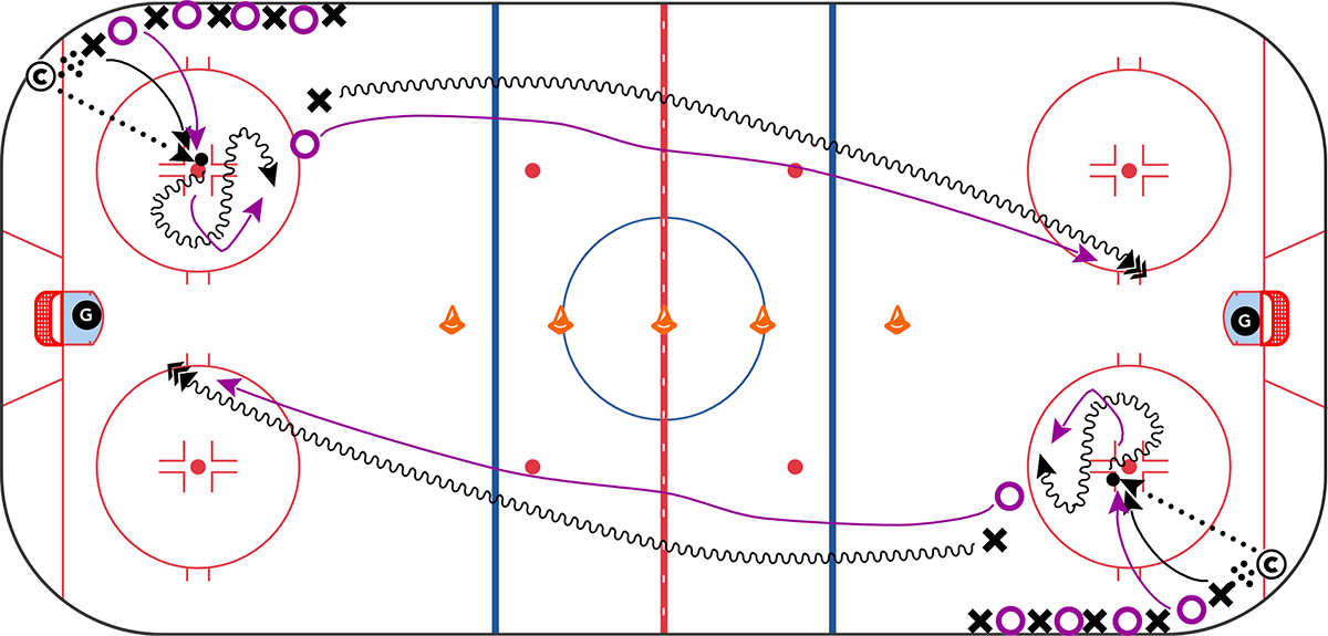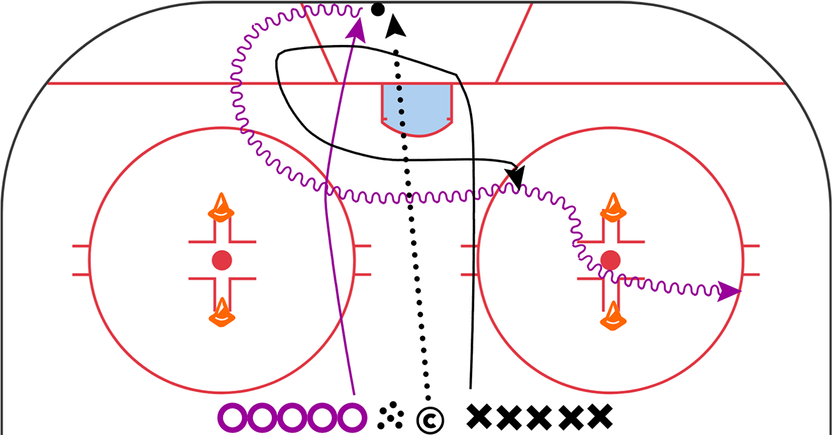 This drill includes a 1v1 battle for possession inside a circle followed by a full ice 1v1 back to the other end (looks like a lollipop when I draw it out, hence the name). It works very well logistically because you can have 2 1v1s happening inside the circles while 2 other 1v1s are happening full ice. Having 8 players competing at once is awesome especially when you might have 30+ players on the ice for the skate.