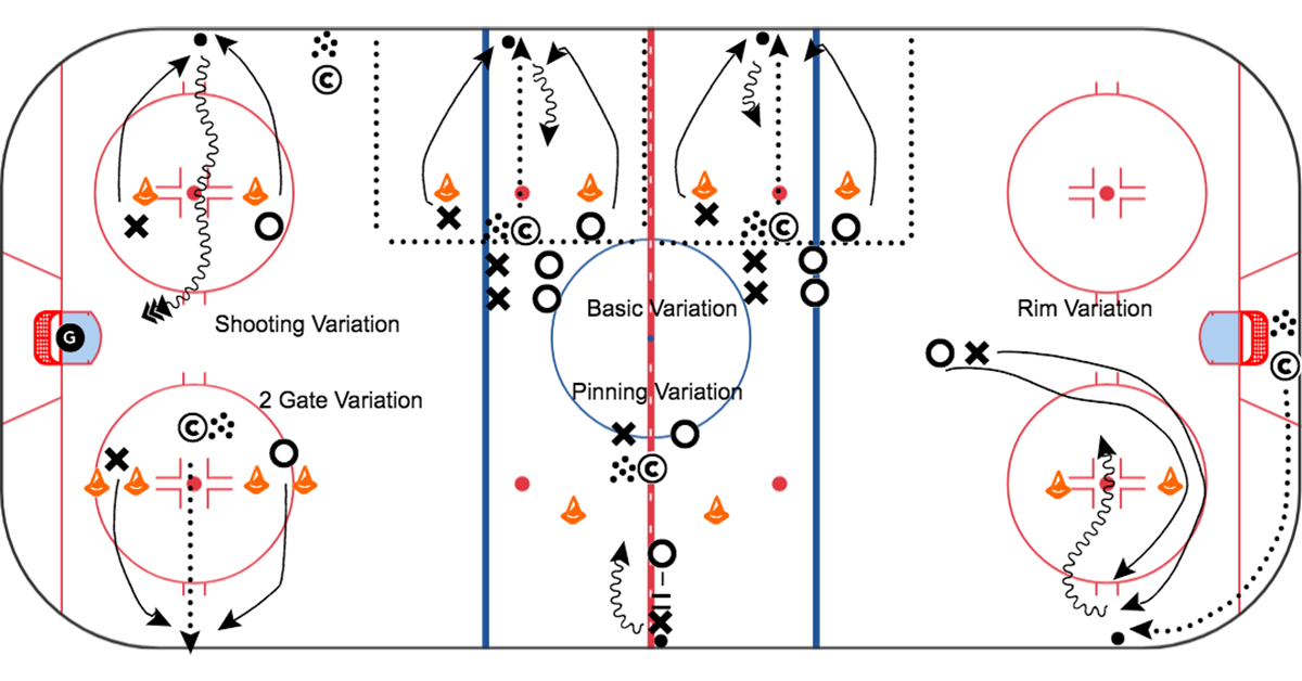 • Pin: Players start in a pin with the puck in between the pinned player's feet. On the coach's go, the players battle for possession and look to skate puck through the gate from the middle of the ice. Can end with skate through gate or a shot on net.