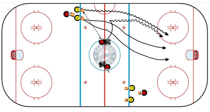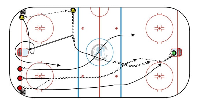 The second the shot is taken, the three forwards on the opposite side begin to skate their puck out of the zone. As they do this, the defenceman who was screening the goalie loops behind the net and provides a backcheck, while the defenceman who took the shot immediately starts playing defense against the three attacking forwards.