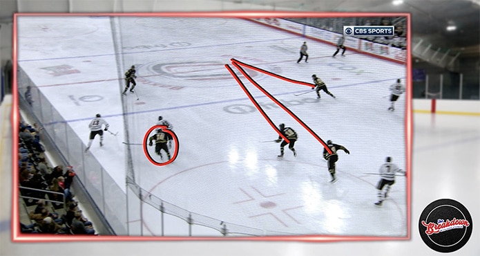 Had the backchecker not changed focus, you don’t get the proper players covered and don’t have your players in the proper position to start your zone entry once you regain possession.