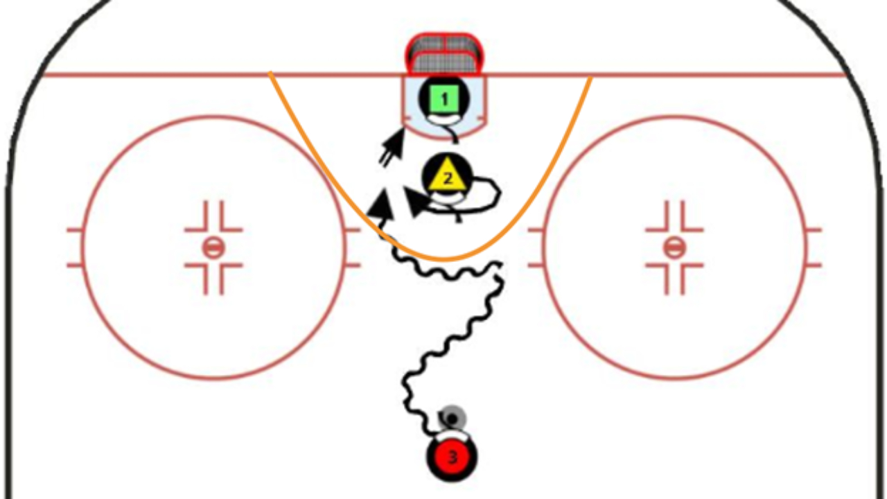 The forward enters the rainbow with the puck and with enough room to have gained some speed. The defender, first without a stick, must use their body to make taking a shot as challenging as possible, trying to get them away from the net and back outside the rainbow.