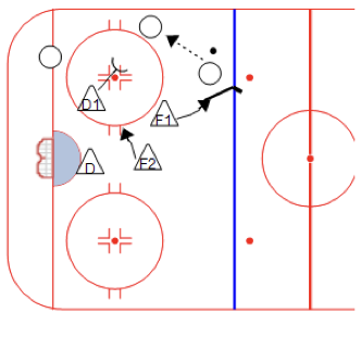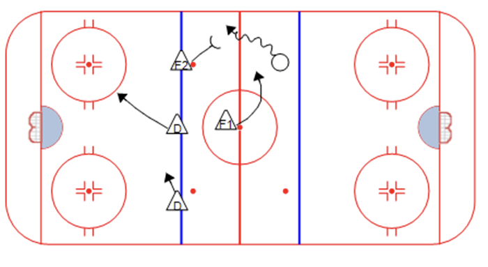 2) “One go—all go”—Three-point pressure works when all players are working together and on the same page. Therefore, all four players on the ice must run their respective routes simultaneously.