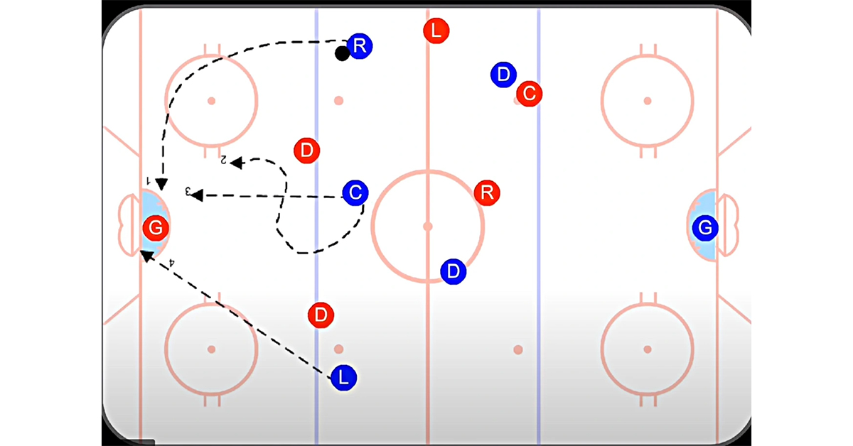 - The player in the outside lane should try to beat the strong side D to the outside with speed and take the puck deep into the zone to force man on man coverage,
