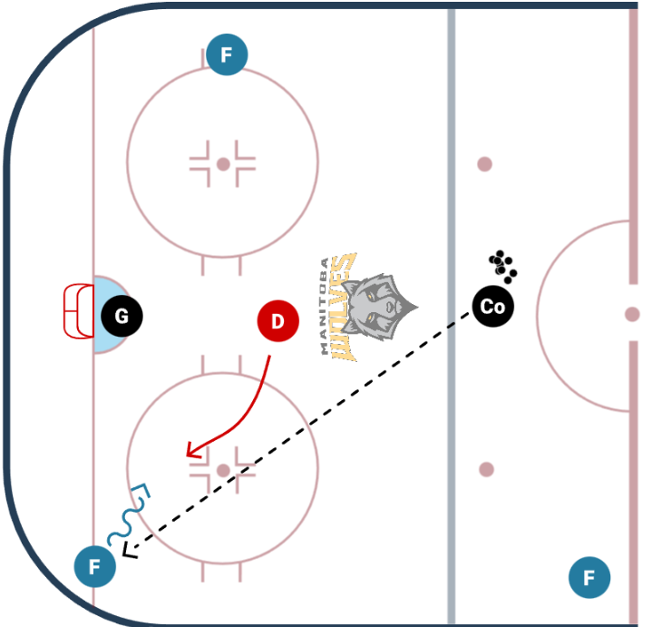 On the whistle, the coach passes a puck to one of the three forwards. The defenseman must quickly identify the threat, close their gap, and play the 1-on-1.