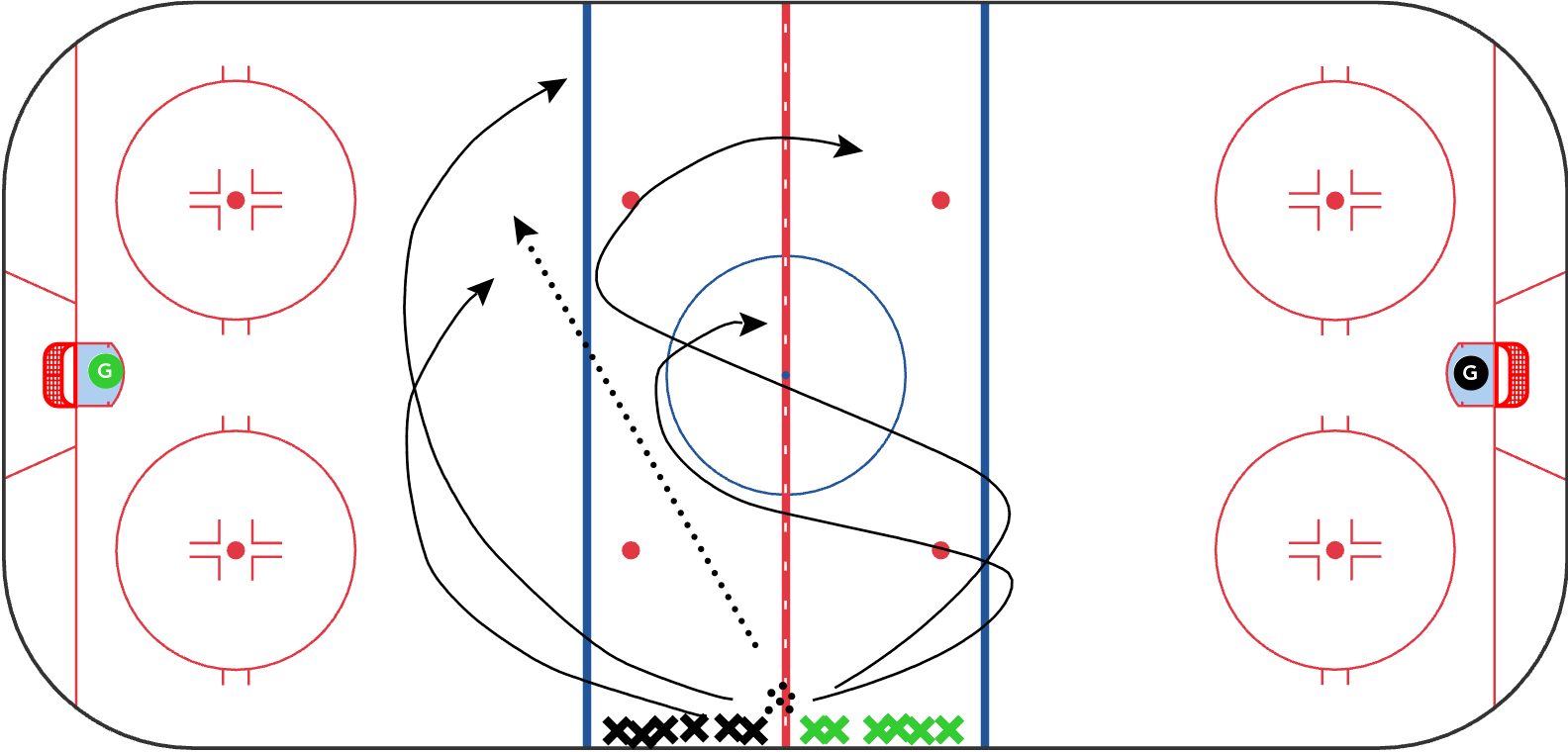 - On whistle, coach spots puck to attacking line who skate 3on2 against D in neutral zone