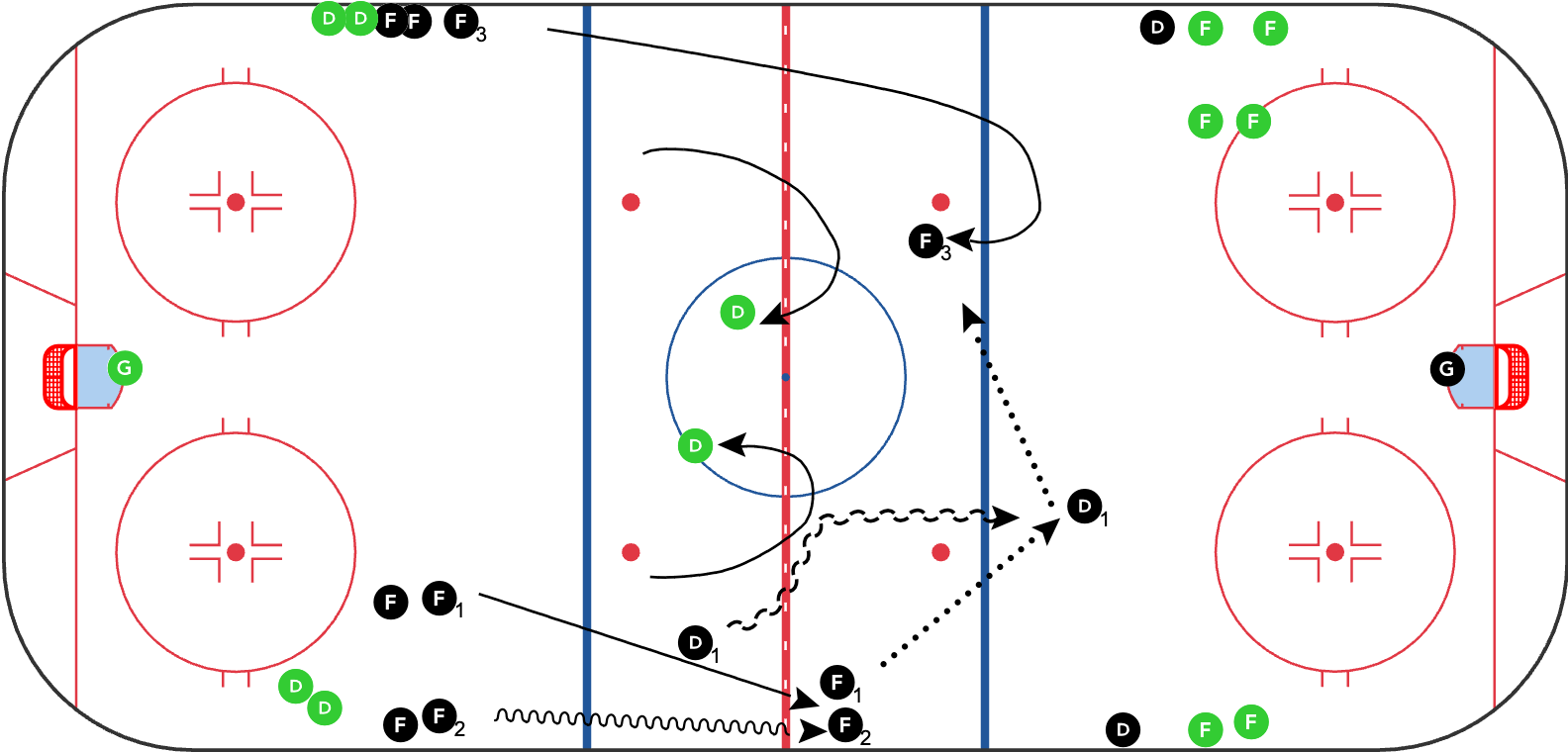 - F1 checks F2 and gives puck to D who regroups forwards (F1, F2, & F3)