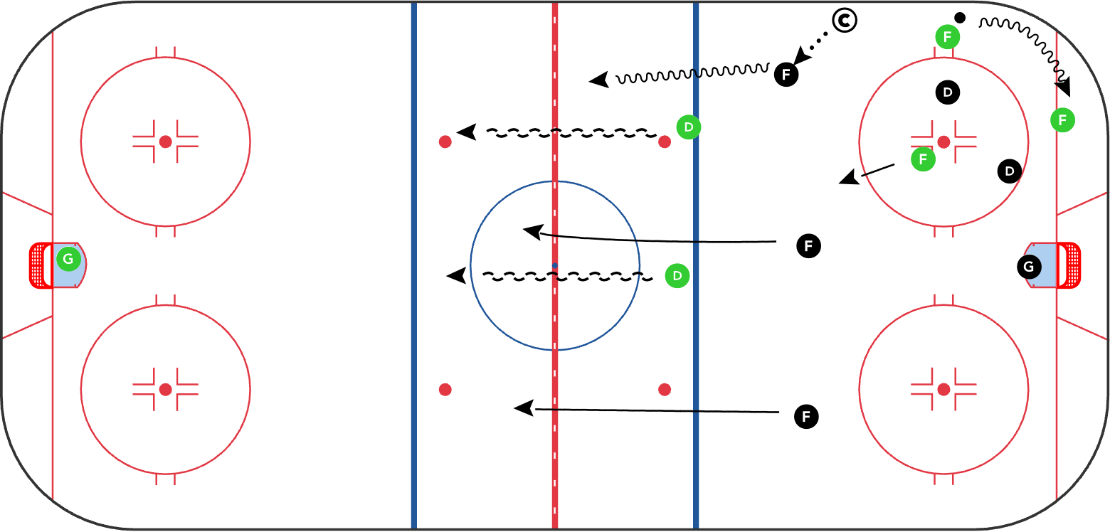 This one is a helpful bit of brainwashing because it immediately demonstrates the benefit of tracking quickly. It focuses on F1 only, so it starts simple. F1 tracks the puck carrier - it can be half speed if you want some room to teach habits - and once he retrieves the puck, he gives it to the D for a regoup and a 3on2 the other way. The hidden benefit of doing it this way is that there are only two players involved in the action at the start, so all eyes will be on them.