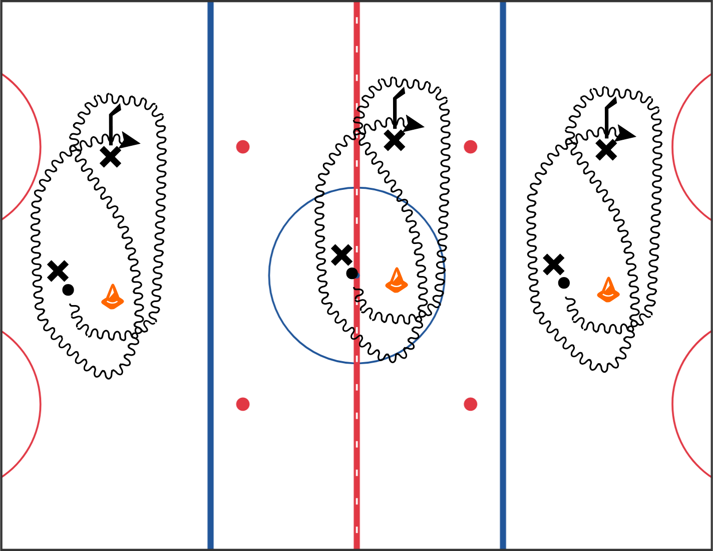 • 2v2 - players who completed the last rep stay in the slot area and battle again - attacker trying to get open for their teammate, defender trying to prevent them from getting the puck