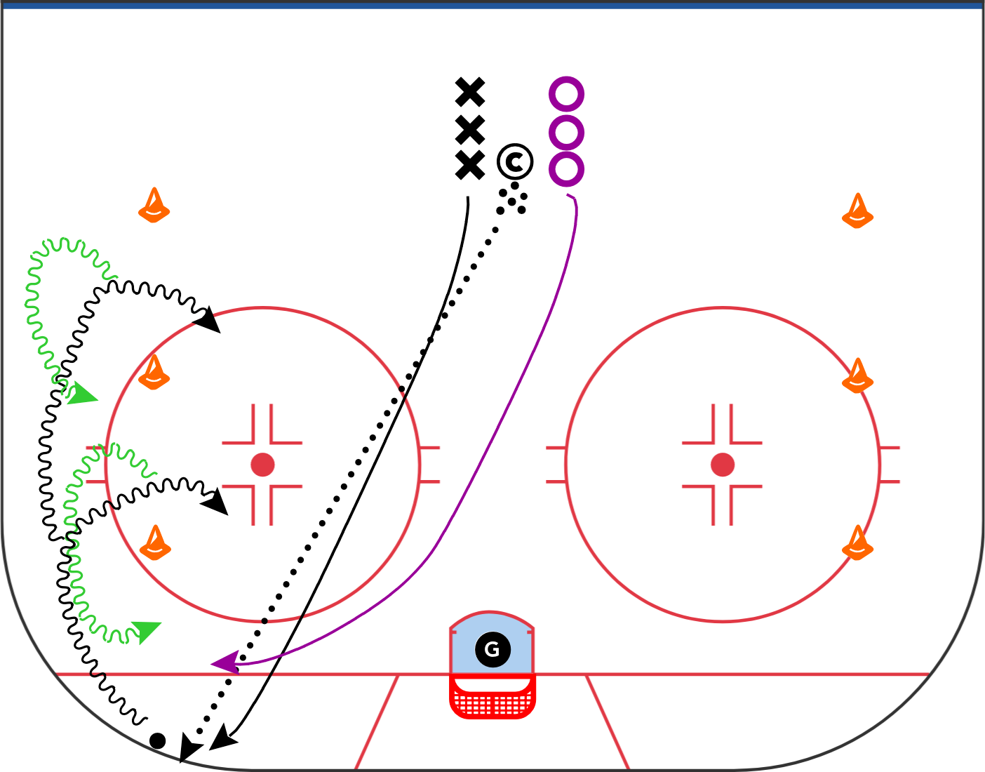 Coach dumps puck into the corner for attacking player to retrieve and start driving up the wall against the defender who is giving chase. Attacker is looking to use their net drive puck protection skills to drive the puck back into the scoring area to generate a high quality scoring chance. Attackers can use tight turns, fakes, turn-backs, crossovers, c-cuts and arm bars to solve the problem of beating that defender with speed while maintaining possession.