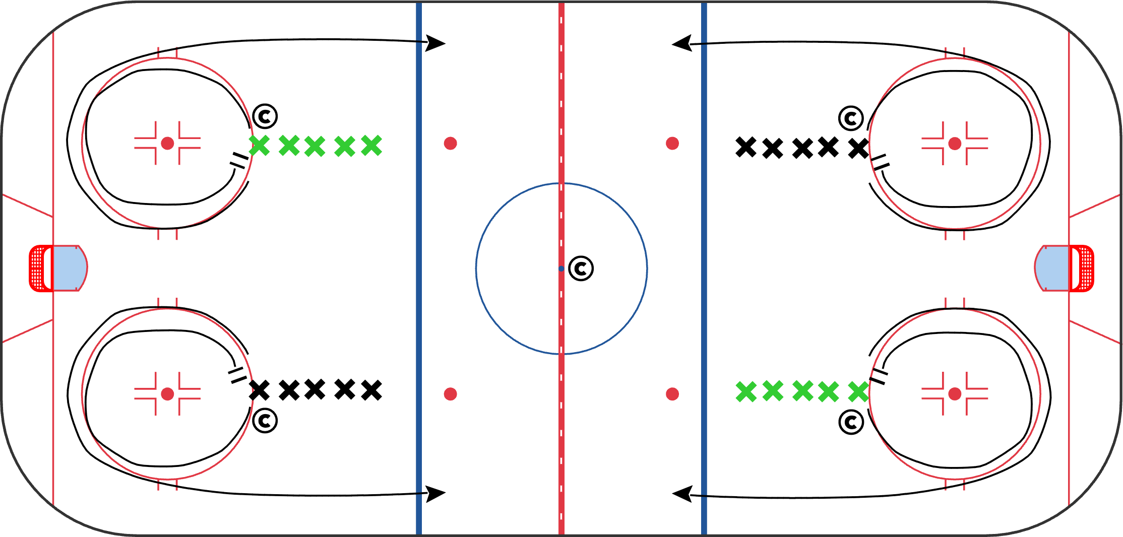 - Players skate around the circle by heading towards the boards first, stopping at the start of the line, and then skating back around the circle until they cross the blue line