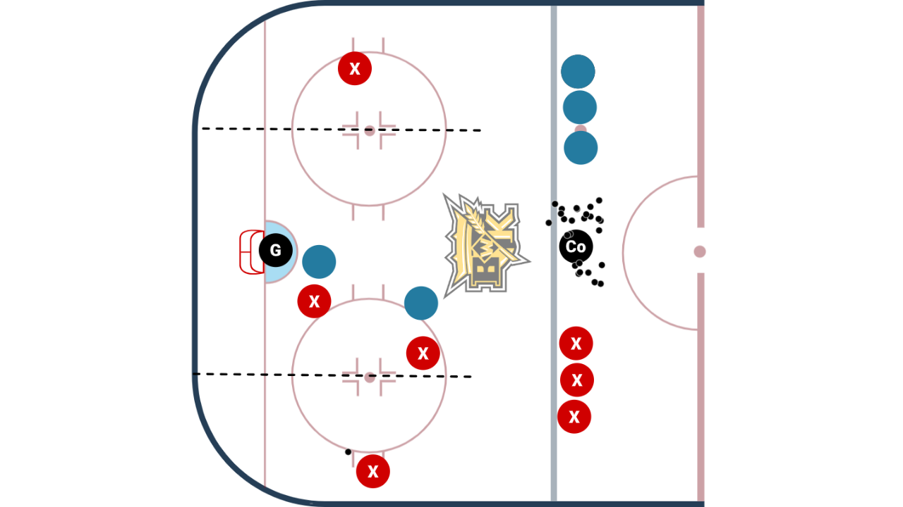 During Brandon Naurato's presentation on the decision zone, he highlighted intriguing statistics about goal-scoring patterns. Notably, 54% of goals are scored from passes originating outside the dots to a slot player, (player maker to goal scorer) while 19% result from rebounds. These represent the two most common ways goals are scored in the National Hockey League. The challenge in youth hockey is how to introduce this concept without overwhelming young players with excessive instructions. Here are some progressive steps that can help;