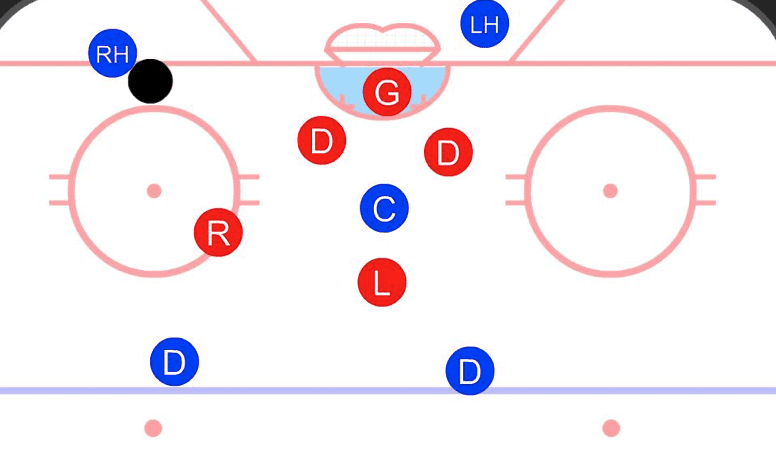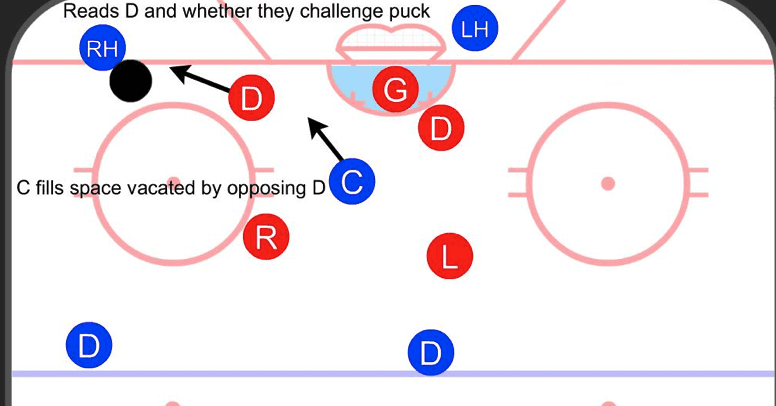 LH gains some width to keep good spacing and not crowd the puck carrier. This also allows for an easy switch to run the PP from the other side.