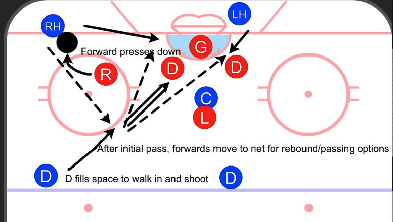 If the RH forward passes to the nearest D and then beats his marker to the net, then it puts the opposing near-post defender in a bind. The D can walk down and shoot or pass to the forwards on either side of the net.