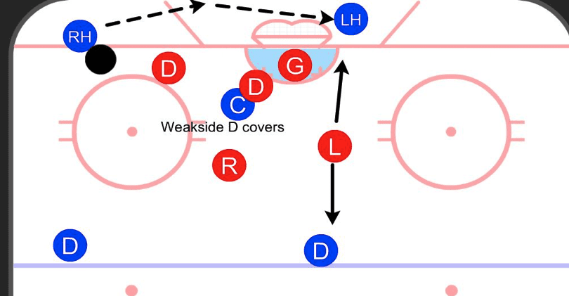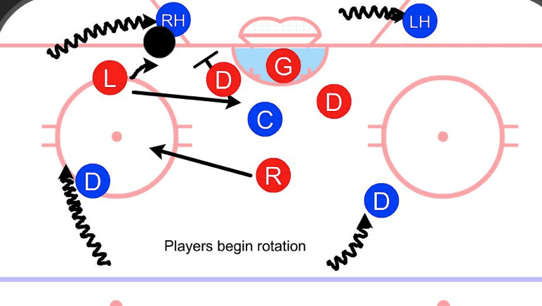 In the film room before the game, you would tell the offensive team to rotate as follows: defencemen drop down near the top of the faceoff circles either for a quick pass back from the puck carrier on the strong side, or a weak-side one-timer option now or after the puck is passed to LH.