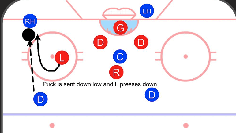 Here we see how a pressure PK would likely unfold as we enter, set up, and then send the puck down low. The PK is anticipating pressuring the puck carrier will result in a pass back to the point where the other PK forward (R) will pick up the pressuring responsibilities.