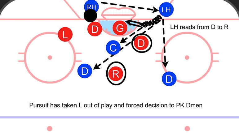If D cuts off C and R cuts off the strong side D, can the weak side offensive D beat L back to the slot? With enough quick movement and the momentary occupation of both L and D by RH, we can turn the penalty killing pressure around and use it against them.