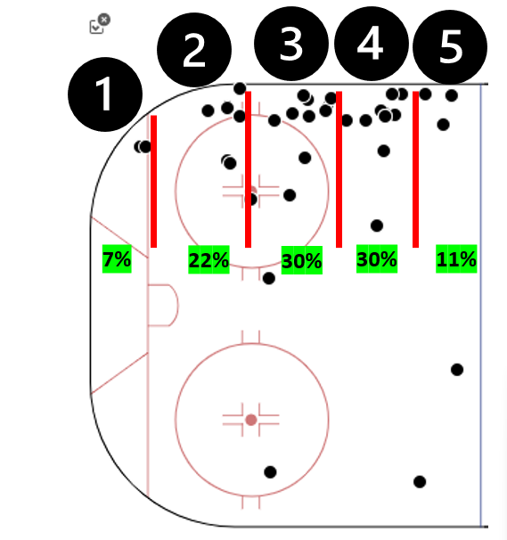 If we break it down further into 5x zones, the majority of touches happen in Zones 3 & 4 accounting for 60% of all touches.