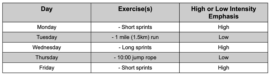 For example, sprints versus jogging or lightly skipping rope. Sprints are hard or fatiguing on the central nervous system and jogging or skipping rope is not. Rather than doing both on the same day, consolidate the stressors and place them on different days. See the tables below.