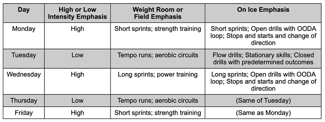 - 4 days a week on ice: High, low, high, low. Two high days should follow a Monday and Wednesday outline to work short and long sprints and drills.