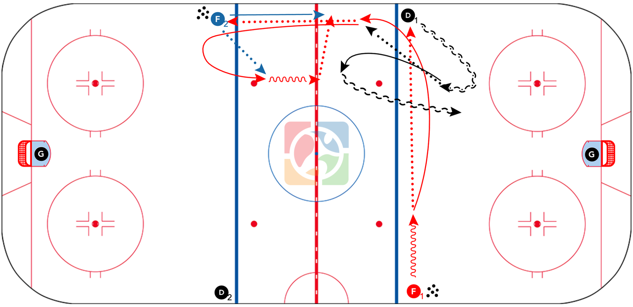 - F1 skates into the space created by D1, D1 passes to F1