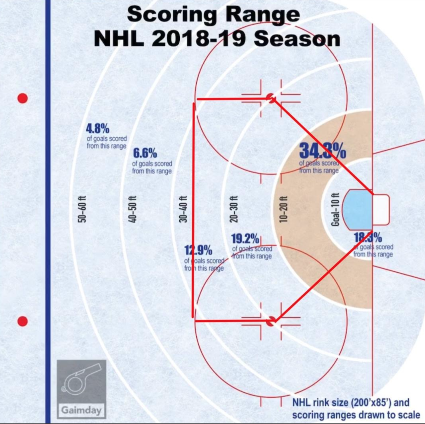 The chart from the 2018-19 NHL Scoring Range Chart reveals the areas and distances in the Offensive Zone where the majority of goals are scored from which is important. The HOUSE is often referred to as the Prime Scoring Area {PSA} and the Game Within The Game, the area from the top of the face off circles to the net. The goals scored range drops the farther you get from the net: