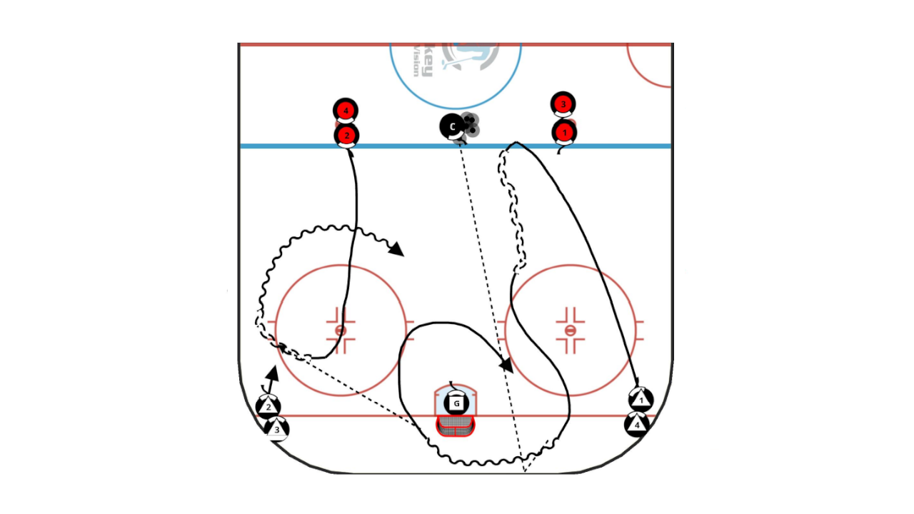 D1 steps up over the blue line, pivots backwards, retrieves the puck, wheels behind the net and makes a break out pass to F2 on the wall. F2 skates up around the face-off circle and goes in for a shot. F2 stops at the net then backs into the face-off circle into position to get a rebound off of the next shooter.