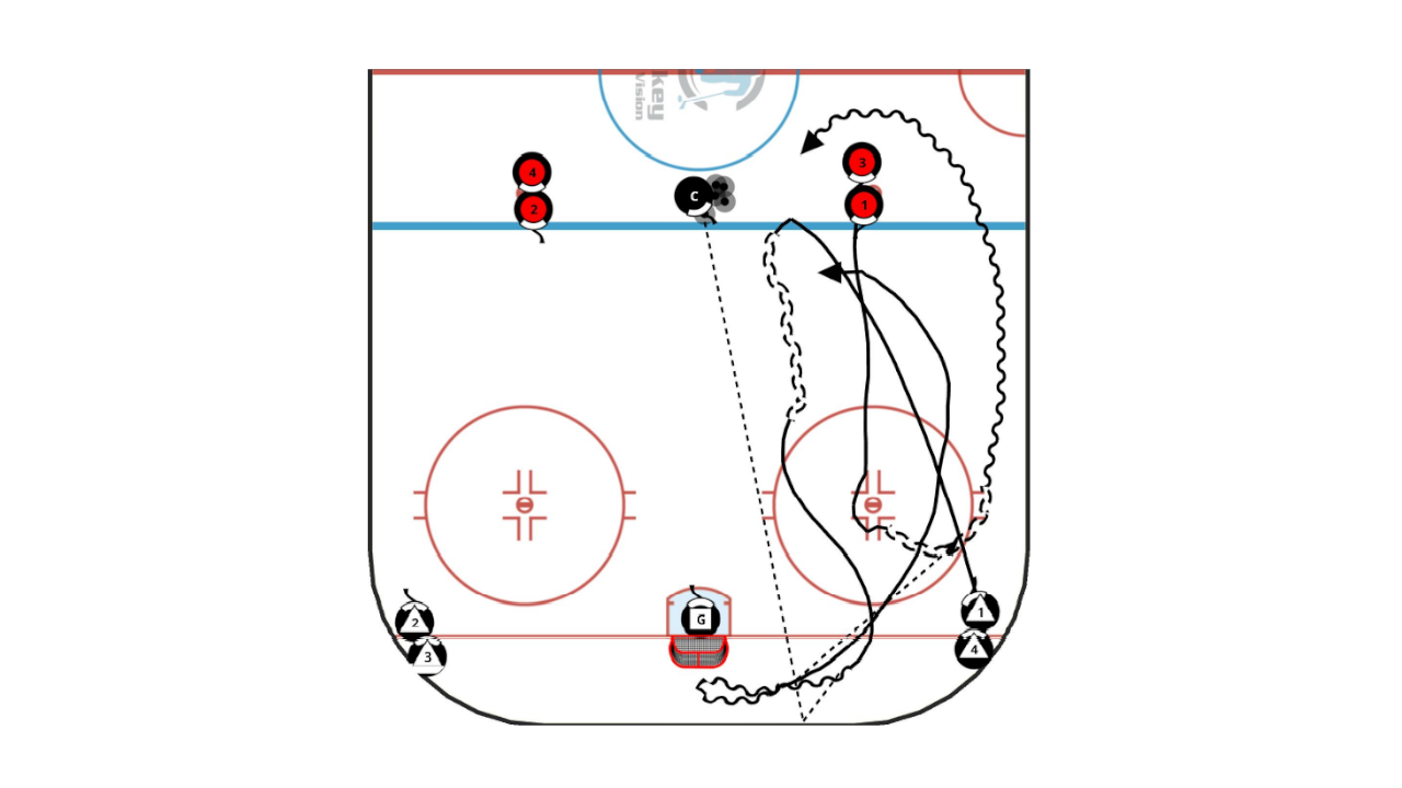 D1 steps up over the blue line, pivots backwards, retrieves the puck, makes an evasive move behind the net and makes a break out pass to F1 on the wall. F1 skates out around the next players waiting in line and attacks back 1v1 against D1 who has gapped up to defend F1.