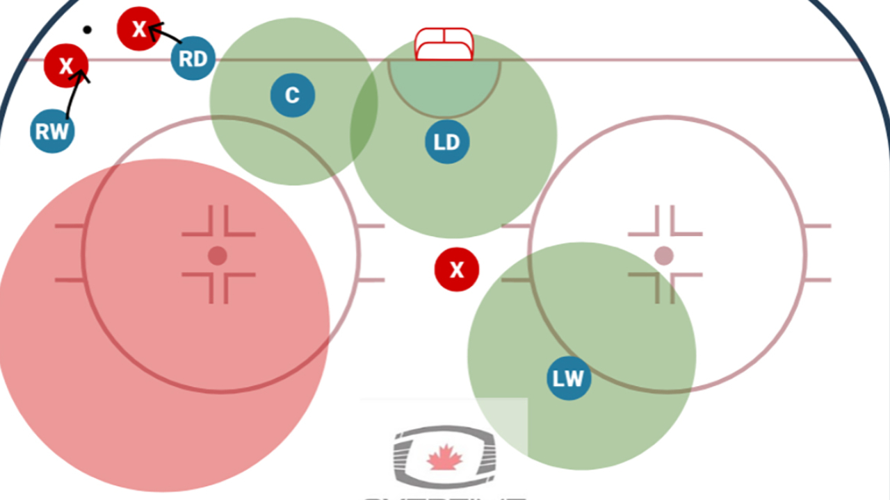 - WSD: Net front zone, good active stick on any opponents in front. Because the Centre has puck-to-post coverage the net front coverage can stretch out to wherever the opponent is in the house, just not past the weak side post.