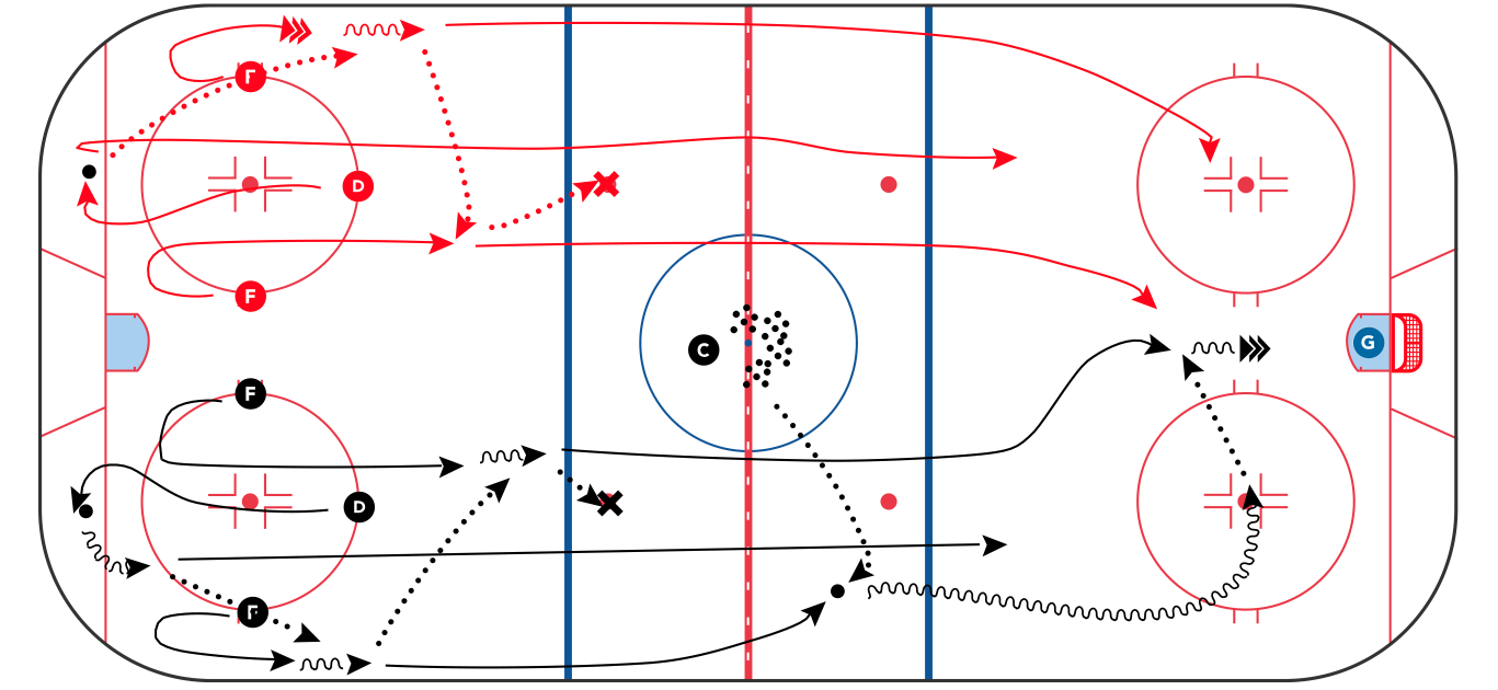 This drill is a favorite among players and coaches because it works on breakouts, passing, speed, zone entry, and in-zone battles for both offense and defense.