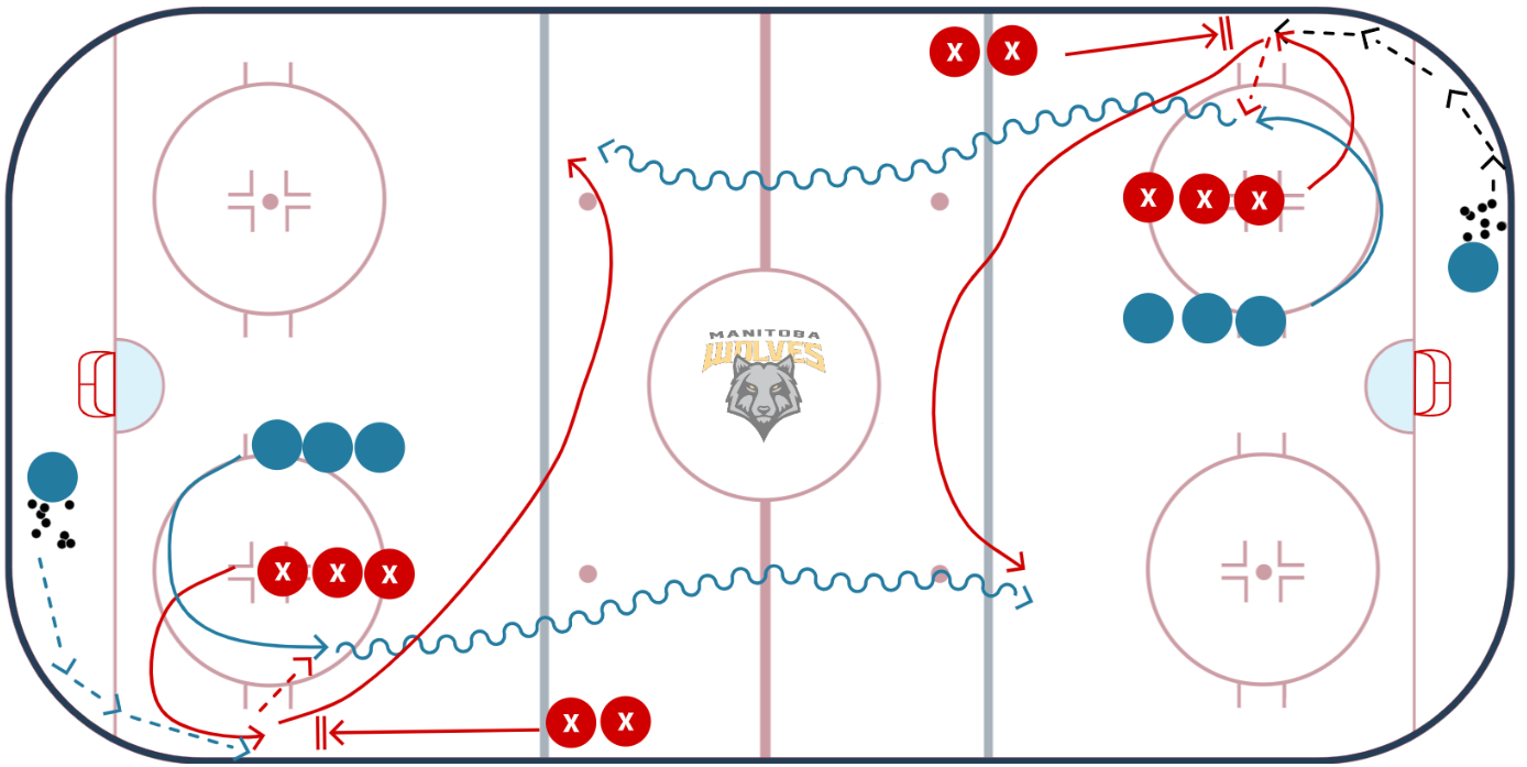 Here you can see a easy half ice or full ice drill that minics what we saw Mckinnon perform during the 2025 playoffs against the Dallas Stars. See the entire presentation on The Coaches Site by clicking, The Importance of Wall Play and How to Incorporate it into Practice
