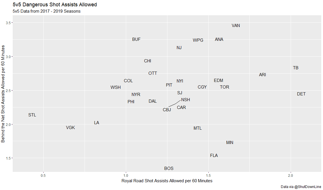 Below is a look at how the Bruins have suppressed Dangerous Shot Assists – shots following passes either across the slot or from below the goal line, which are significant predictors of expected goals at the team level. Cassidy is right in that these chances are the most dangerous and the team does an exception job at preventing them. Again, this data comes from Corey Sznajder and is from the last two seasons, Cassidy’s first two full seasons with the Bruins. The sample size averages out to be around 40 games per team.
