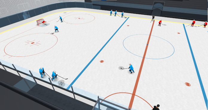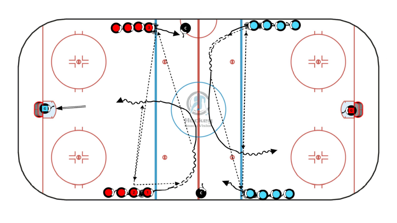 This is a one-touch passing warm-up drill for higher-level players. For youth players, you can run the same drill but have the players stop and hold the puck for a split second without stick handling before passing.