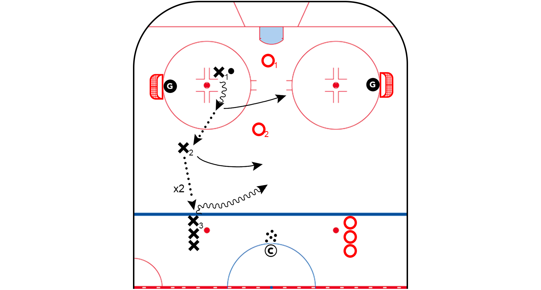 - Drill begins from a 2v2 cross ice format with the coach spotting a puck in the zone.