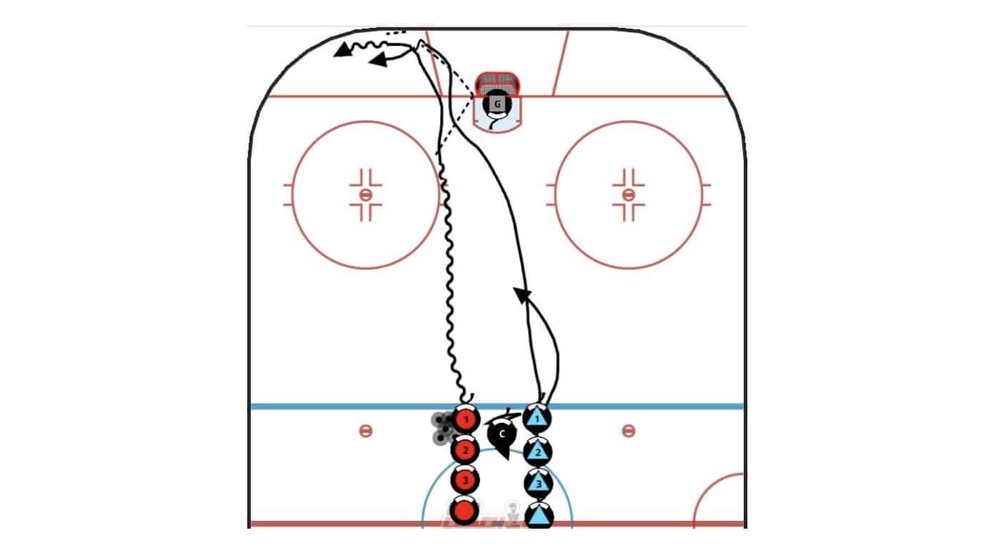 Split the team in half, one team is on offense and the other is on defense. Coach initiates the game by tapping first offensive player in line (F1). F1 starts with breakaway. Coach taps first defensive player in line (D1) who back checks. Coach then chooses when to activate extra defenders and attackers to control the scenario. Can be 1v1, 2v2, 2v2, or 3v2. Offensive team gets a point for scoring and defensive team gets a point for breaking the puck out over the blue line with FULL CONTROL. Each team gets 5 minutes on offense and 5 minutes on defense. Losing team skates.