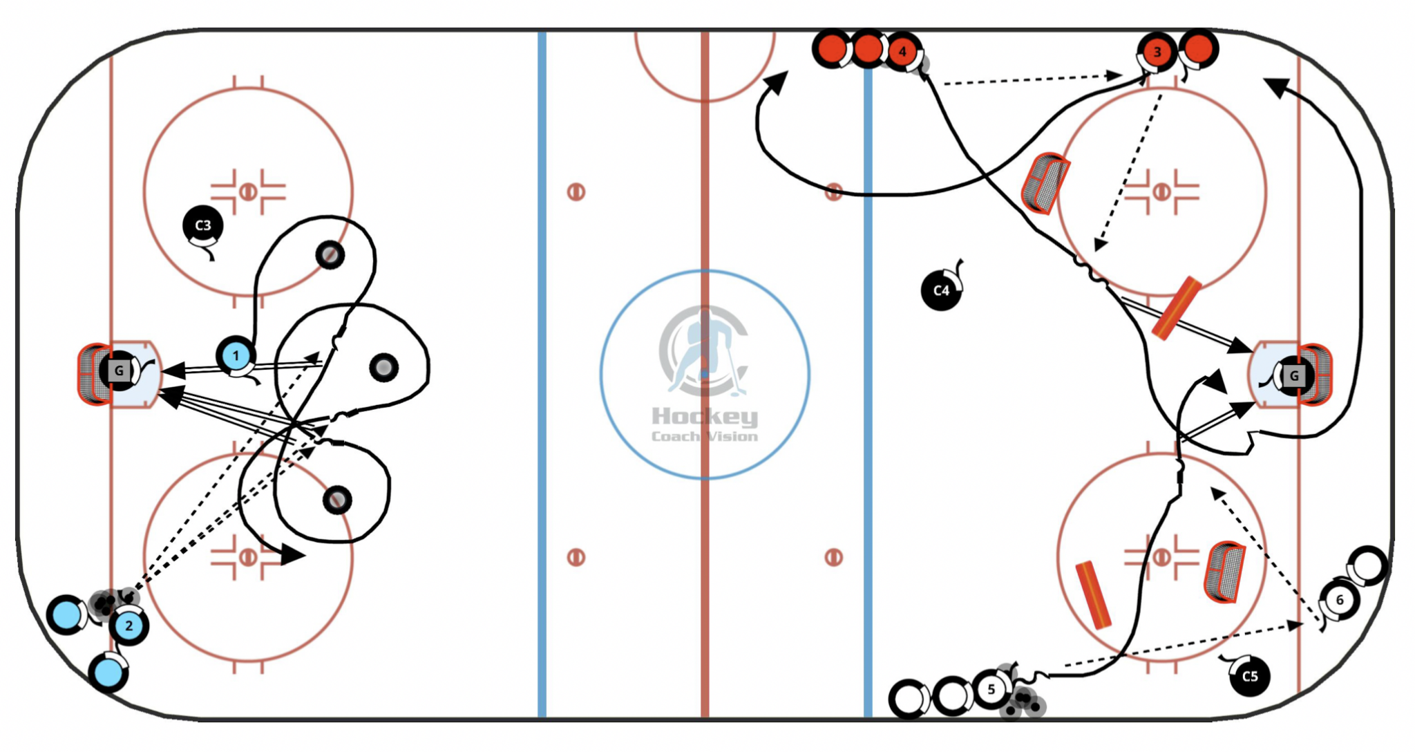 Station 3: Shooter skates randomly through the tires, receives passes from the corner passers, catching the pass and releasing the shot quickly.