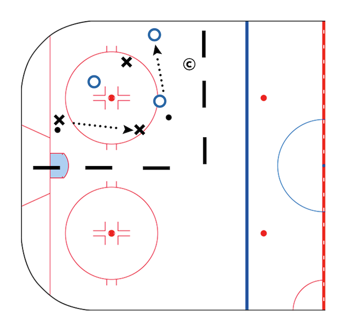 On the whistle players skate around with their heads up practicing puck handling technique and passing to their teammates.